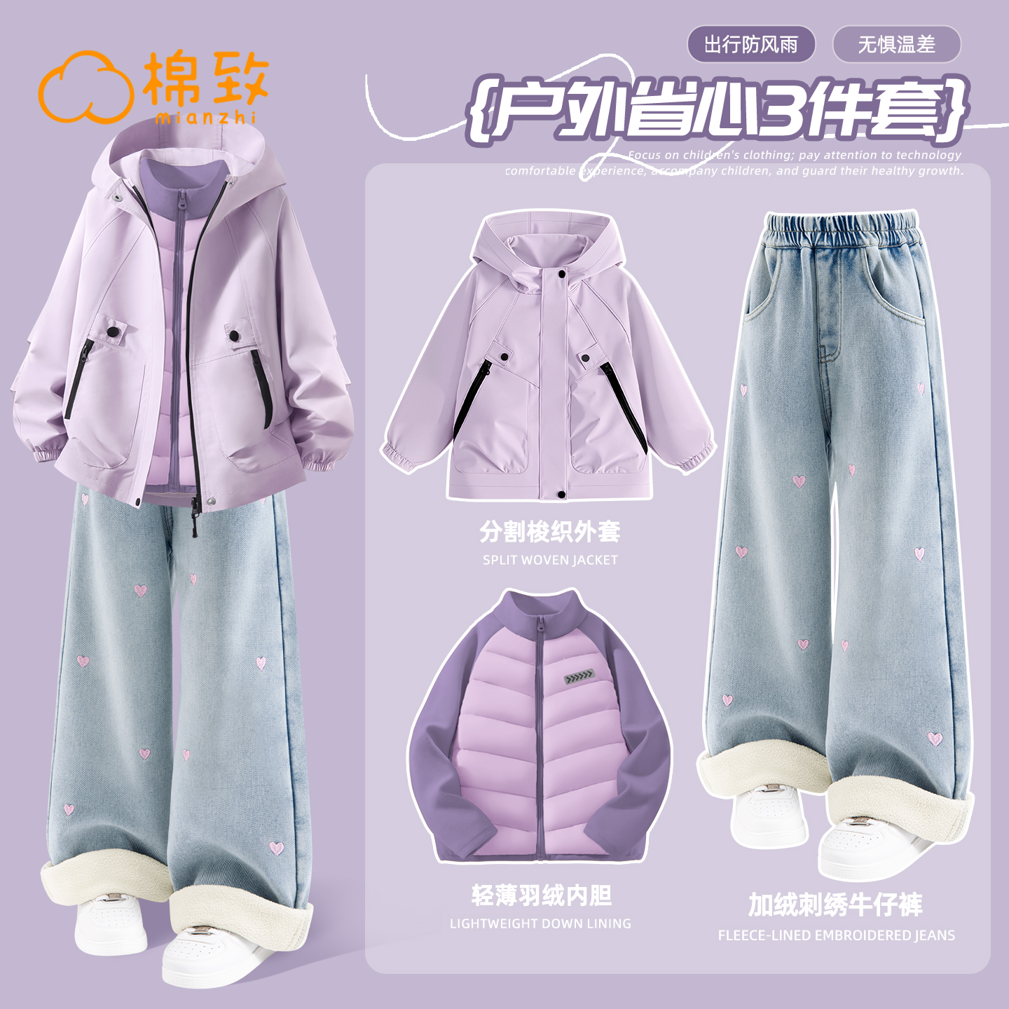 棉致女童套装2025新款秋冬户外冲锋外套女大童运动服冬季儿童冬装