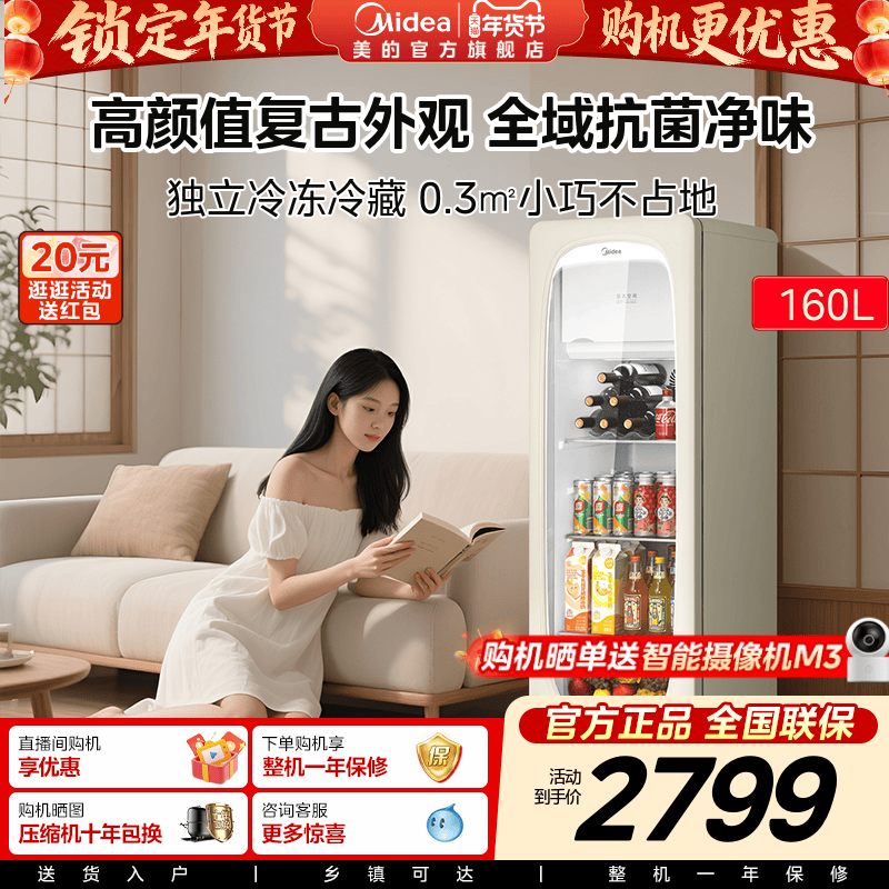美的可爱多冰箱160L家用冰吧小型冷藏保鲜柜客厅透明玻璃冷冻饮料