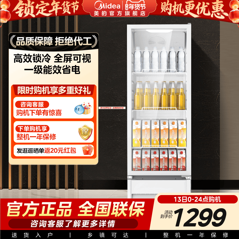 美的318白饮料展示柜冷藏冰柜保鲜柜商用立式冷柜超市小冰箱官方