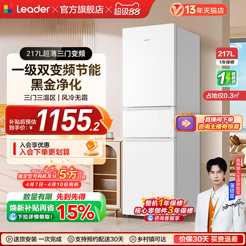 换新补贴海尔出品统帅217L三开门一级变频无霜租房家用小冰箱官方