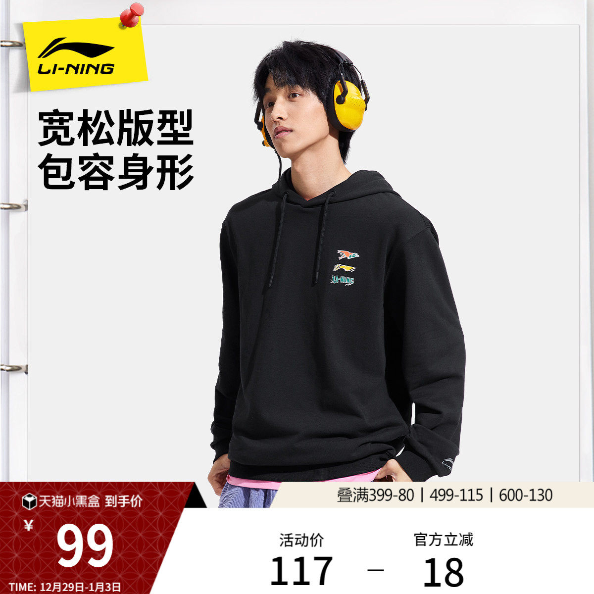 李宁卫衣男冬季官方新款情侣连帽衫长袖薄款黑色上衣针织运动服女