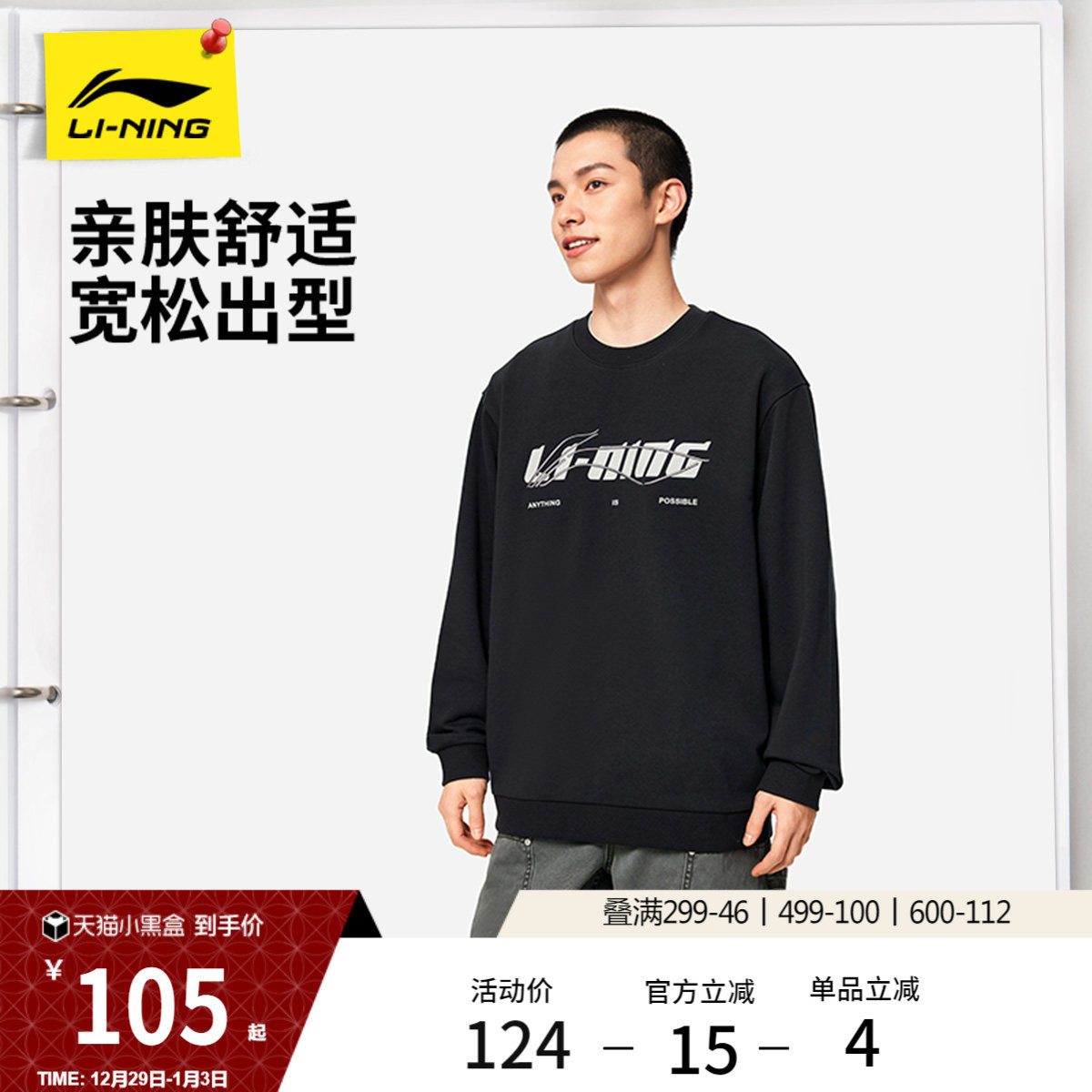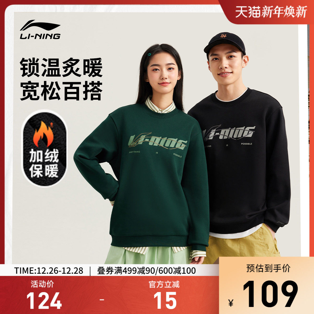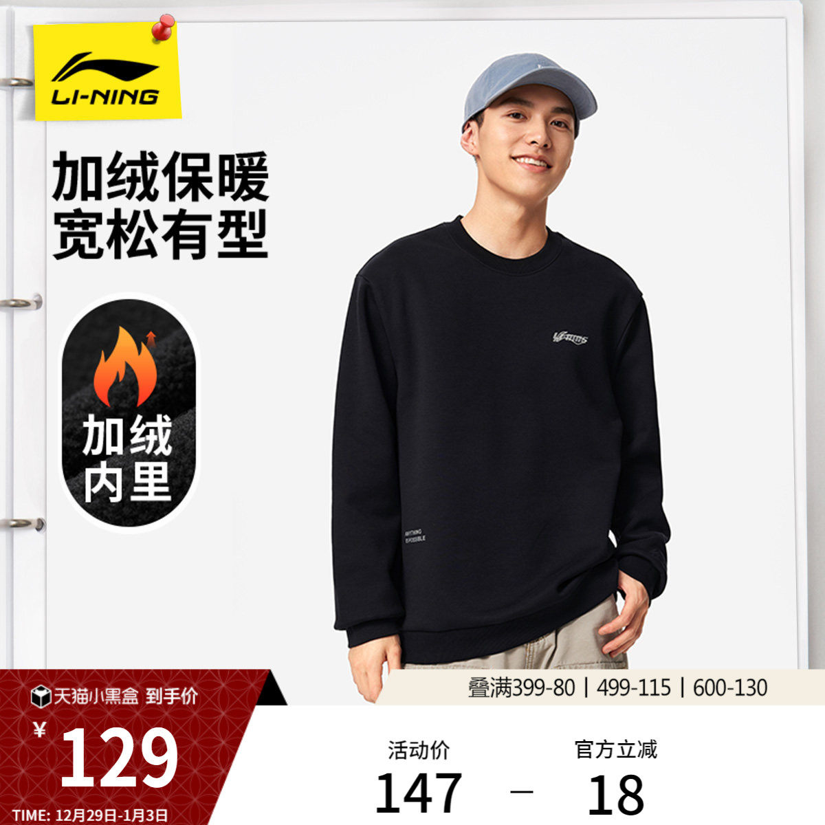 李宁加绒卫衣男士冬季情侣圆领套头衫黑色上衣宽松长袖运动服女款