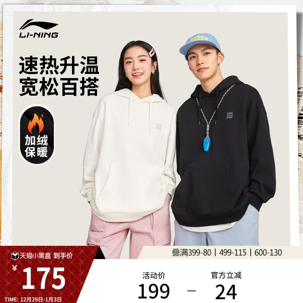 李宁加绒卫衣男冬季官方新款情侣连帽上衣休闲加绒长袖运动服女款