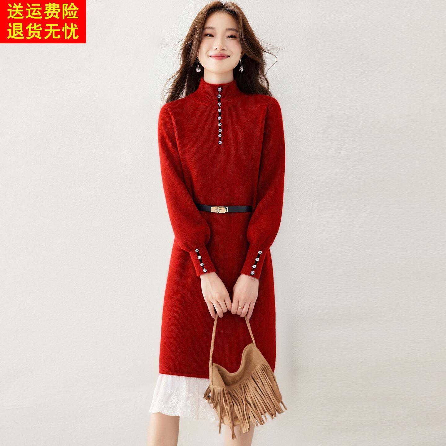 高端针织长袖连衣裙女秋冬中长款半高领收腰显瘦拼接蕾丝打底裙子