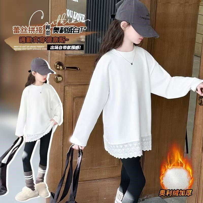 女童长袖加绒打底衫百搭秋冬中大儿童洋气蕾丝边拼接T裙中长款t恤