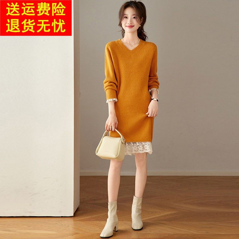 高端针织长袖连衣裙女秋冬小个子中长款V领拼接蕾丝显瘦打底裙子