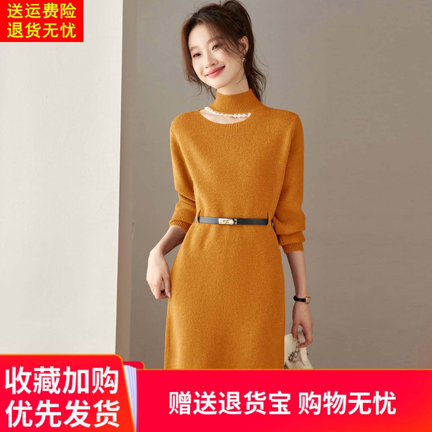 高端针织长袖连衣裙女秋冬半高领中长款收腰显瘦拼接蕾丝打底裙子