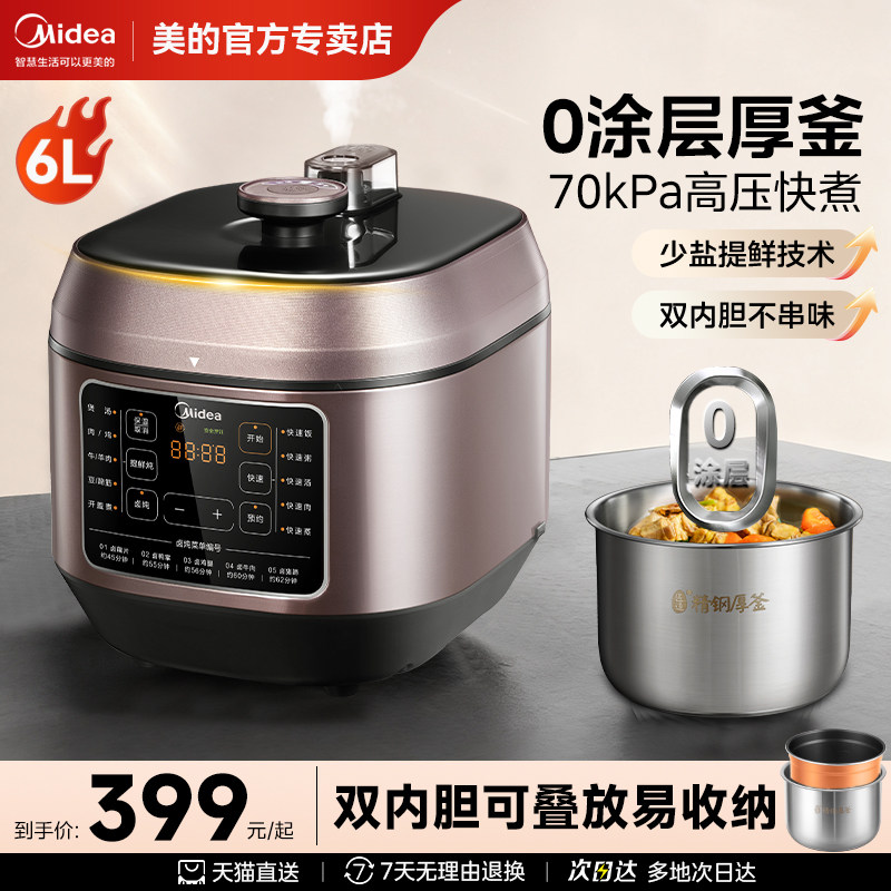 美的电压力锅家用6L升不粘内胆电高压锅饭锅一体双胆饭煲官方正品
