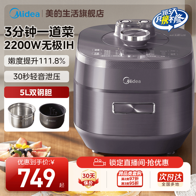 美的IH电压力锅家用新款不锈钢内胆智能多功能5L高压锅煮饭煲官方
