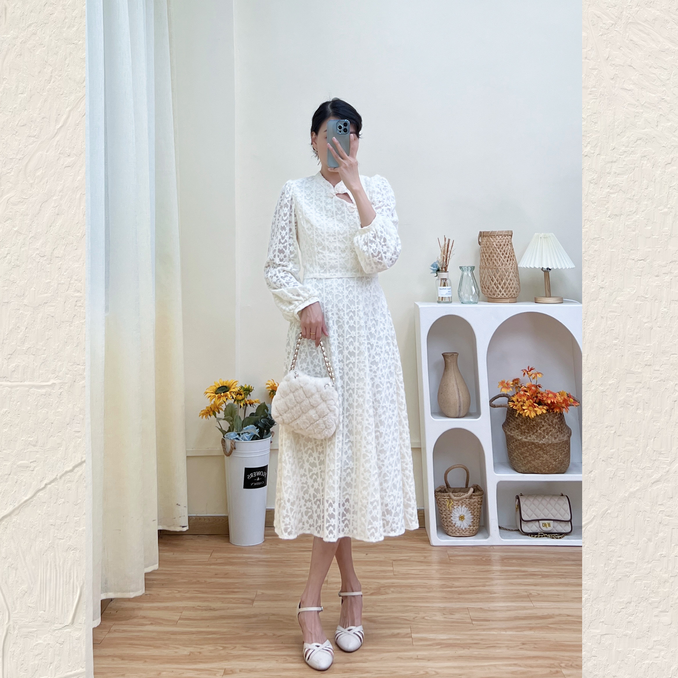 仙女白色蕾丝连衣裙2025秋新款法式气质显瘦温柔长袖长裙420