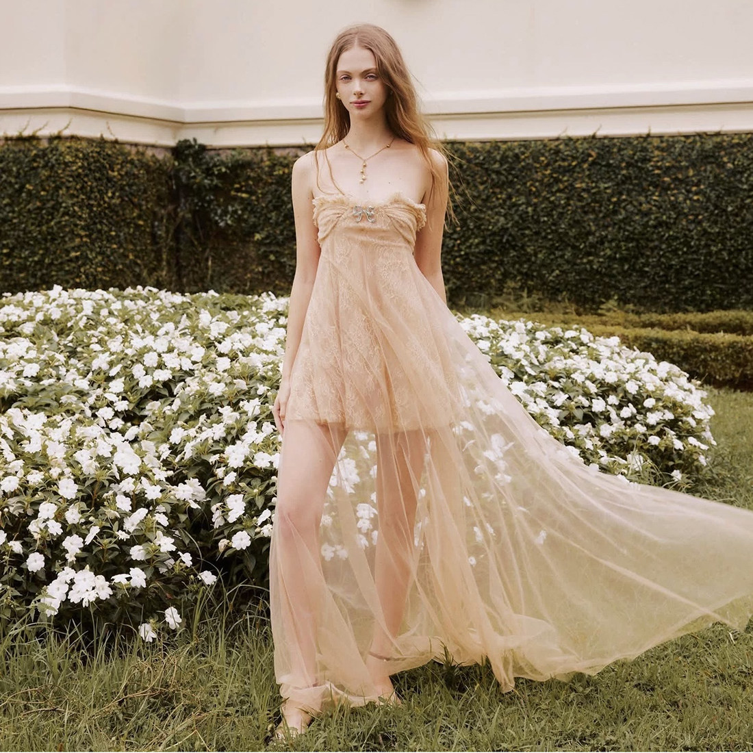 2025越南小众仙女连衣裙女神亮片蕾丝网纱鱼骨抹胸连衣裙礼服长裙