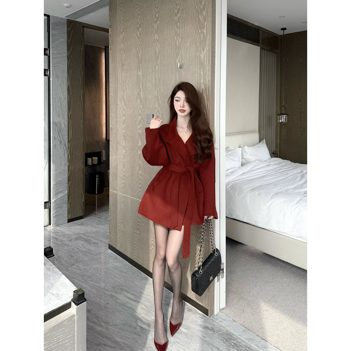 - 红色长款毛呢大衣女