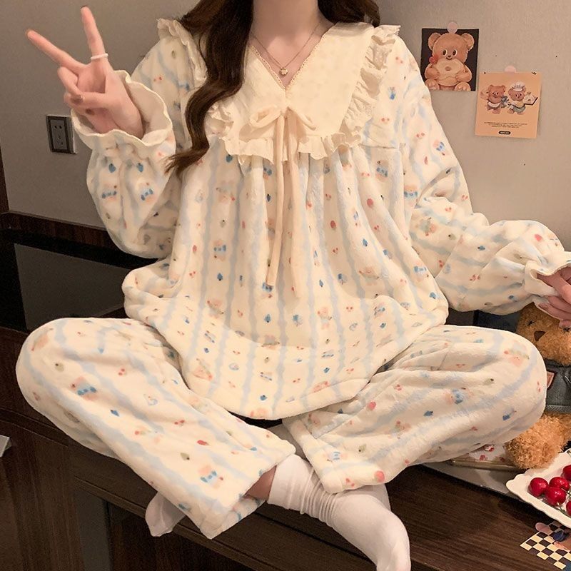 日系风睡衣女秋冬可外穿韩版加厚珊瑚绒甜美休闲加绒法兰绒居家服