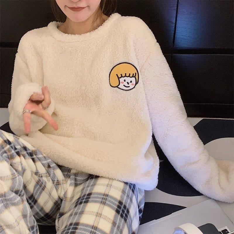 韩版珊瑚绒睡衣女甜美可爱学生卡通圆领少女宽松法兰绒家居服套装