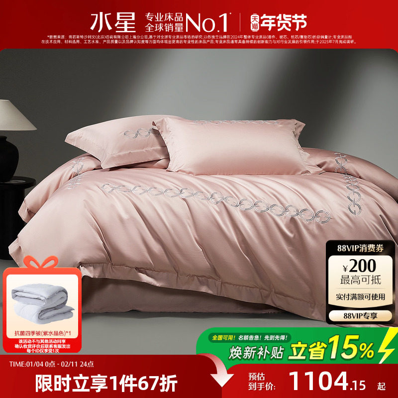 水星家纺200S双股长绒棉四件套贡缎抗菌套件高端轻奢简约刺绣被套