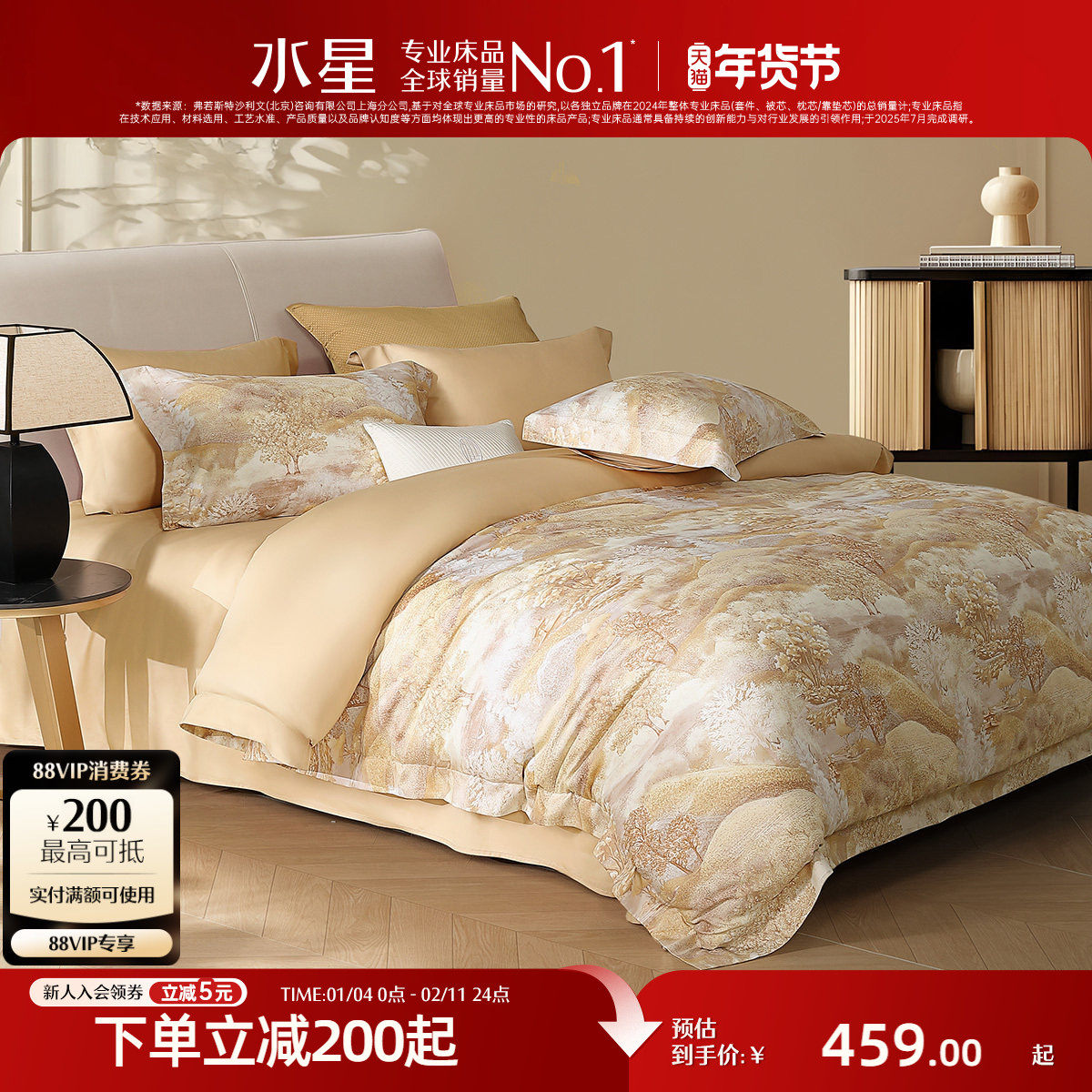 水星家纺100支双股长绒棉四件套高端贡缎套件印花礼物新年送礼