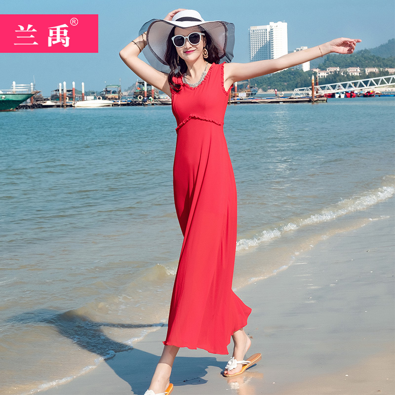 复古大红色飘逸V领无袖大摆雪纺连衣裙女海边度假沙滩裙长裙纯色