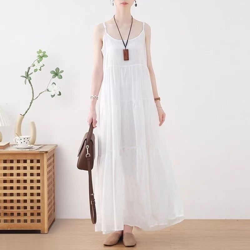 棉麻吊带连衣裙女纯色夏季新款气质设计高级感显瘦度假沙滩长裙子