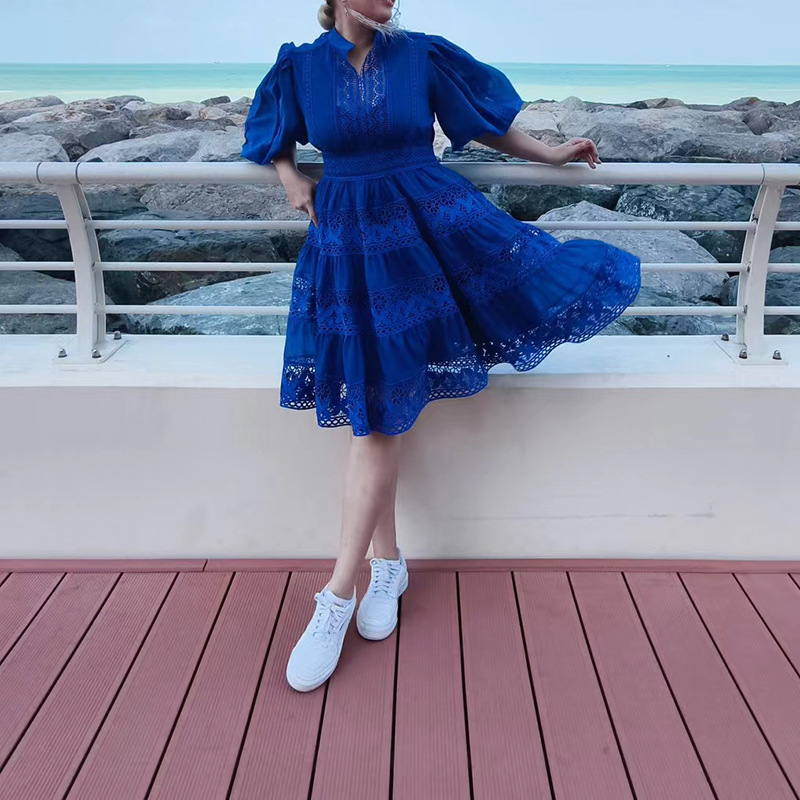 新款秋季沙滩度假风2025时尚立领泡泡袖高腰设计纯色刺绣连衣裙女