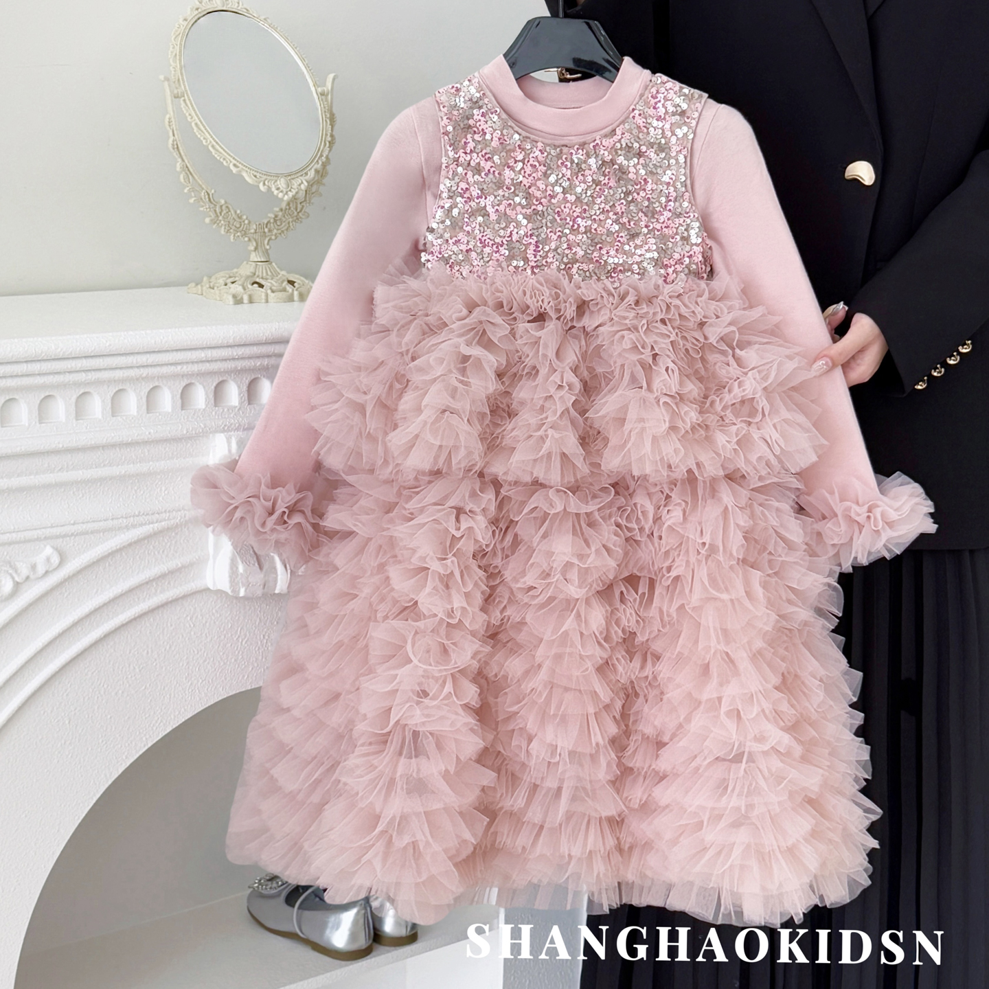 闪闪亮片女童公主裙秋冬丝绒粉色洋气儿童连衣裙生日礼服蓬蓬裙子