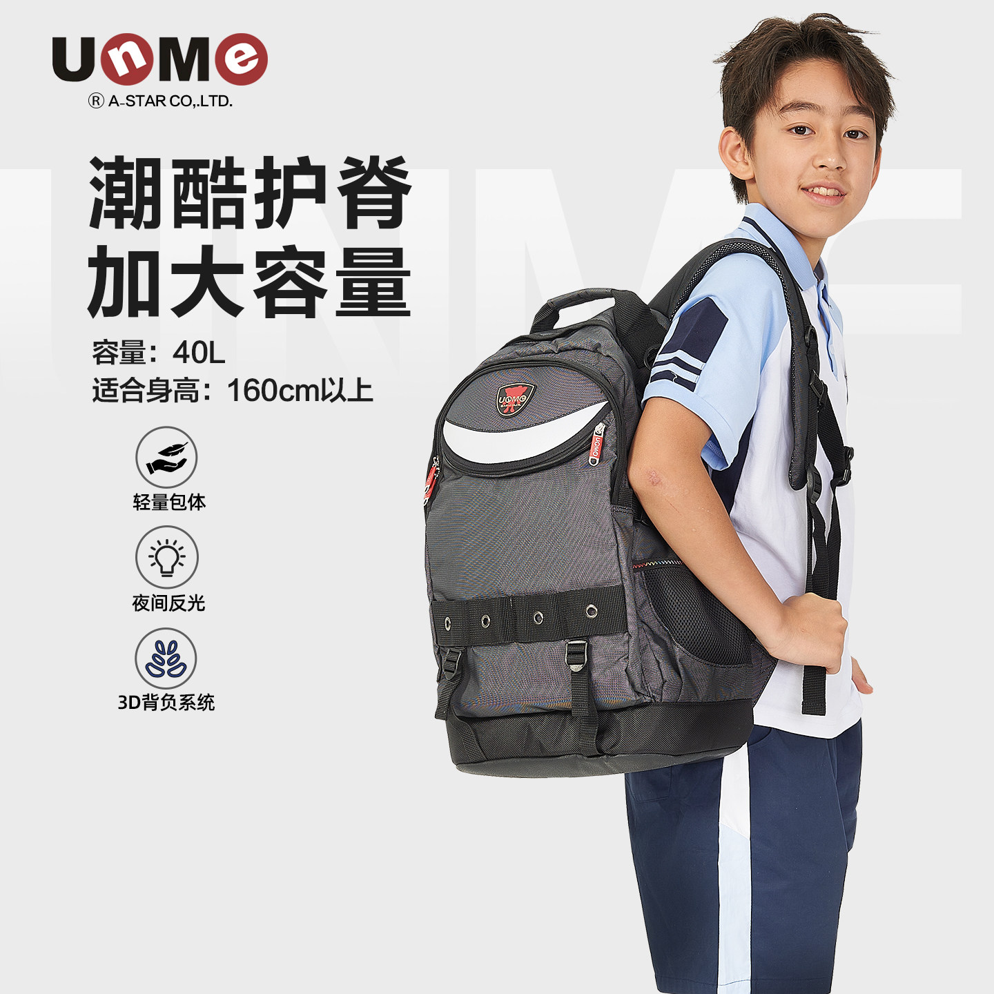 unme中学生书包男大容量高中生初中超轻护脊耐磨减负青少年双肩包