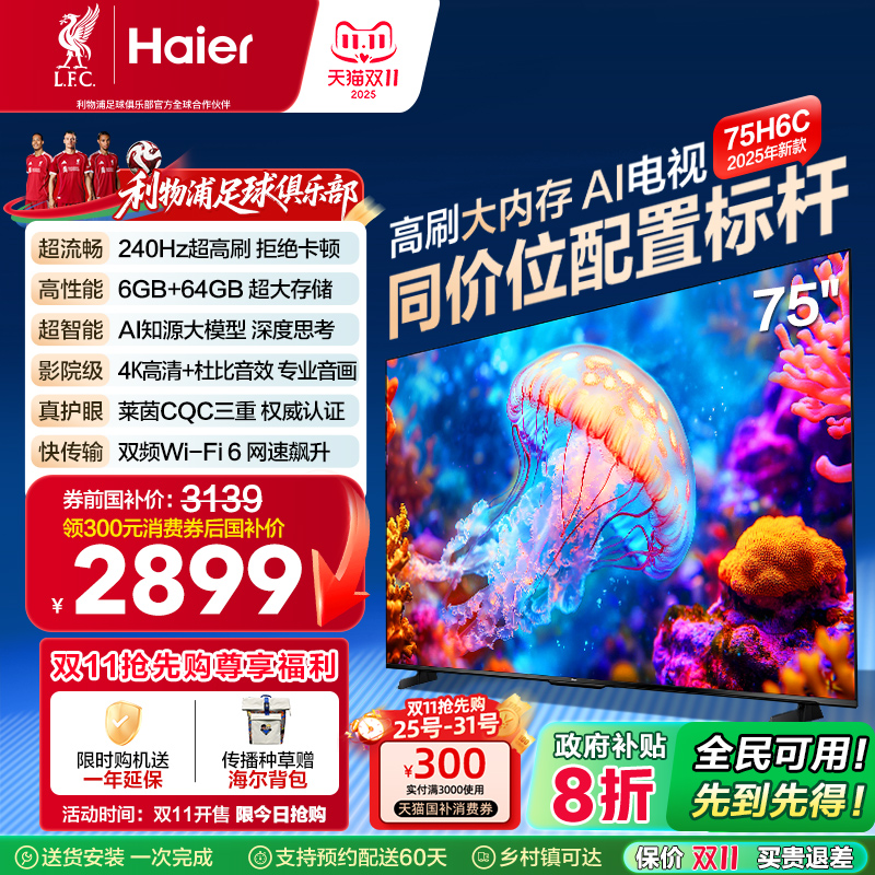 海尔国民AI电视75H5C 2025新款75英寸家用液晶电视机以旧换新补贴