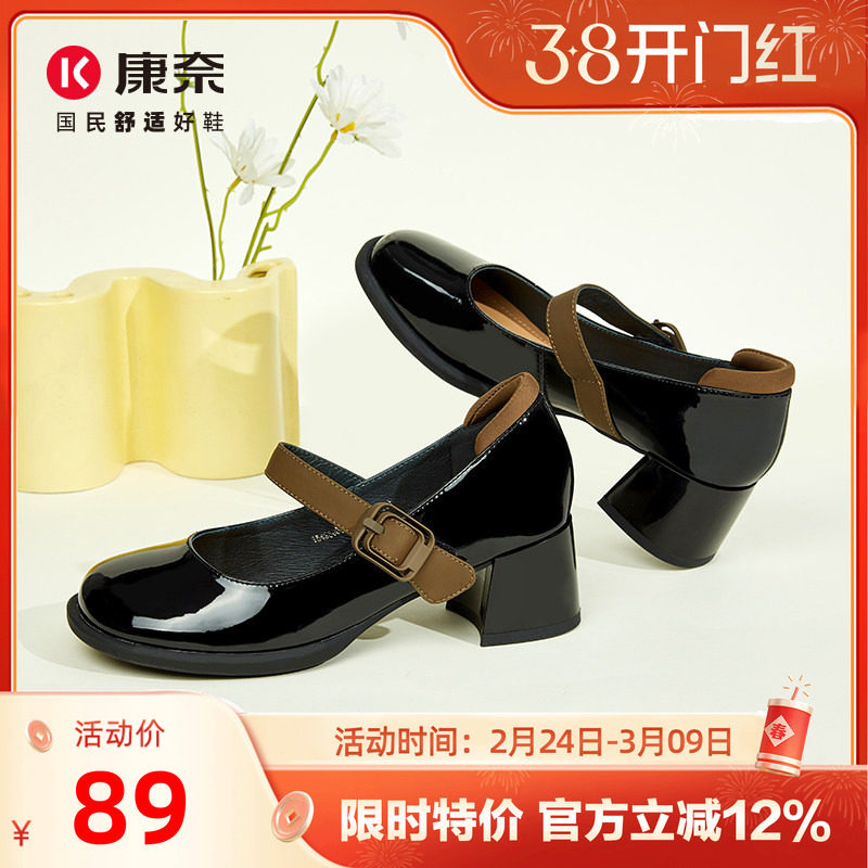 羊皮版~复古浅口高跟鞋女山茶花一字扣粗跟单鞋尖头气质玛丽珍鞋