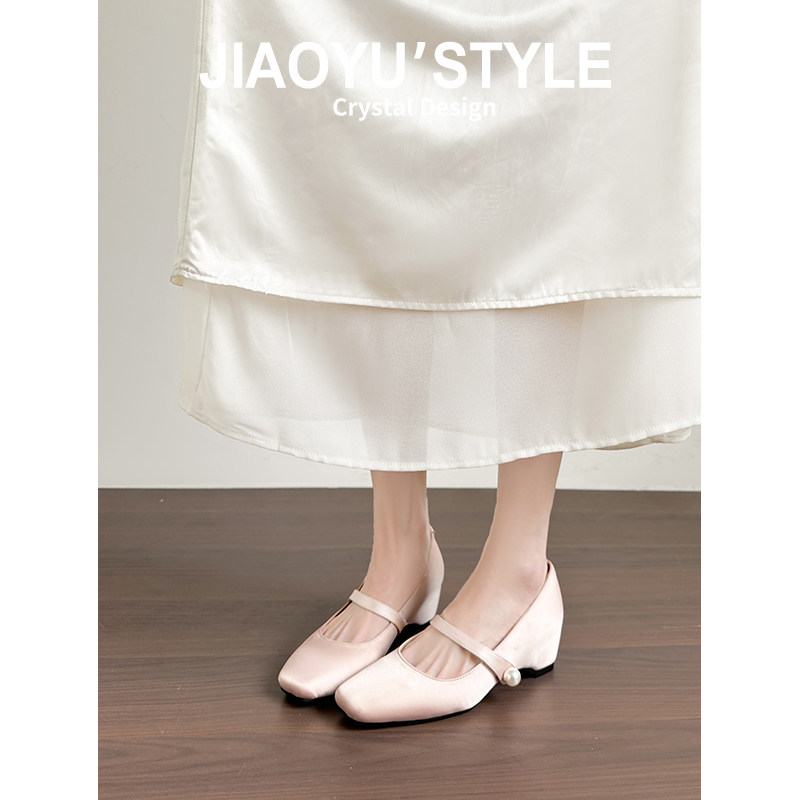 真皮~骄屿裸色方头粗高跟鞋女通勤珍珠扣一字带晚晚风玛丽珍单鞋