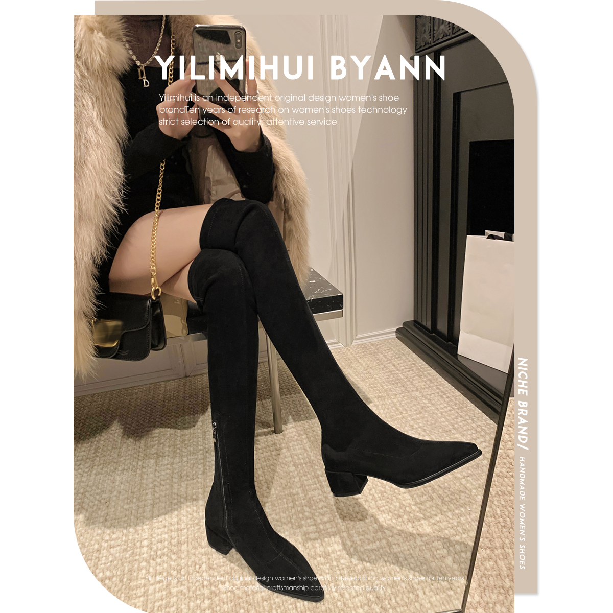 2023秋冬季欧美尖头过膝长靴粗跟平底骑士靴百搭瘦腿长靴长筒靴子