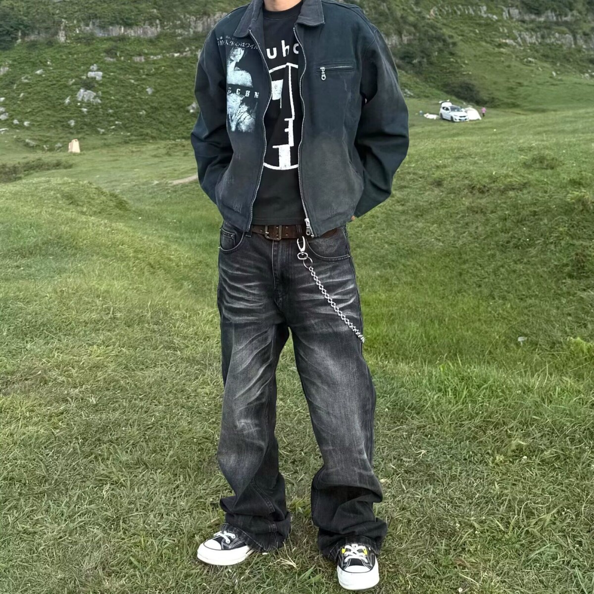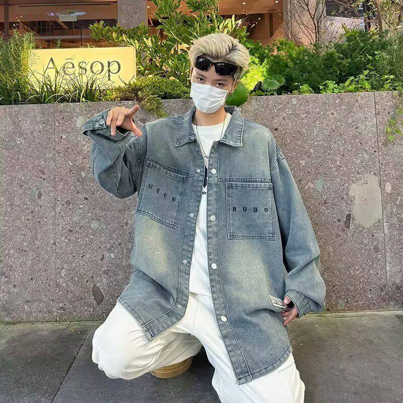 日系复古牛仔外套男秋季韩版潮流百搭帅气宽松休闲运动工装夹克男