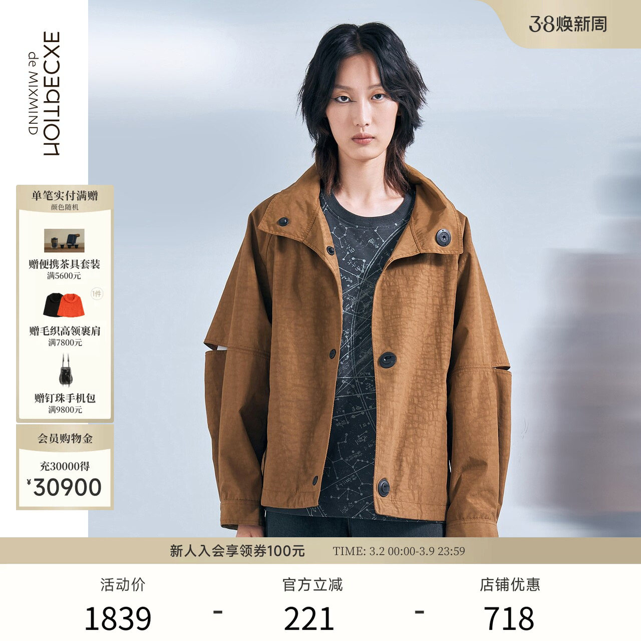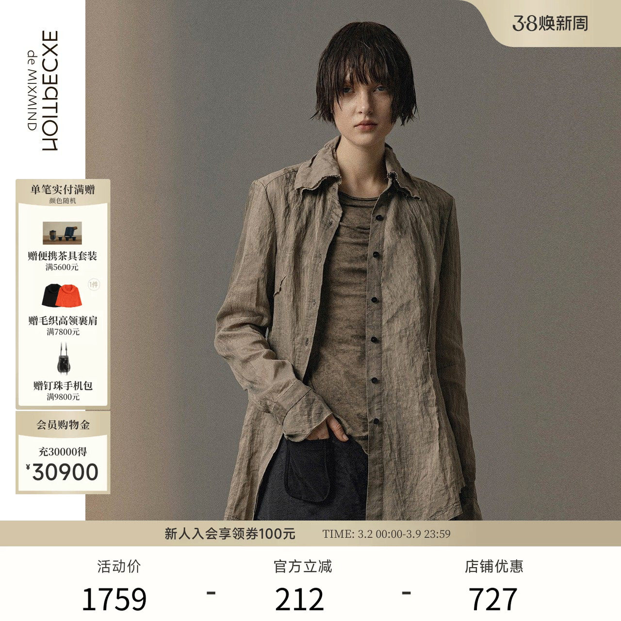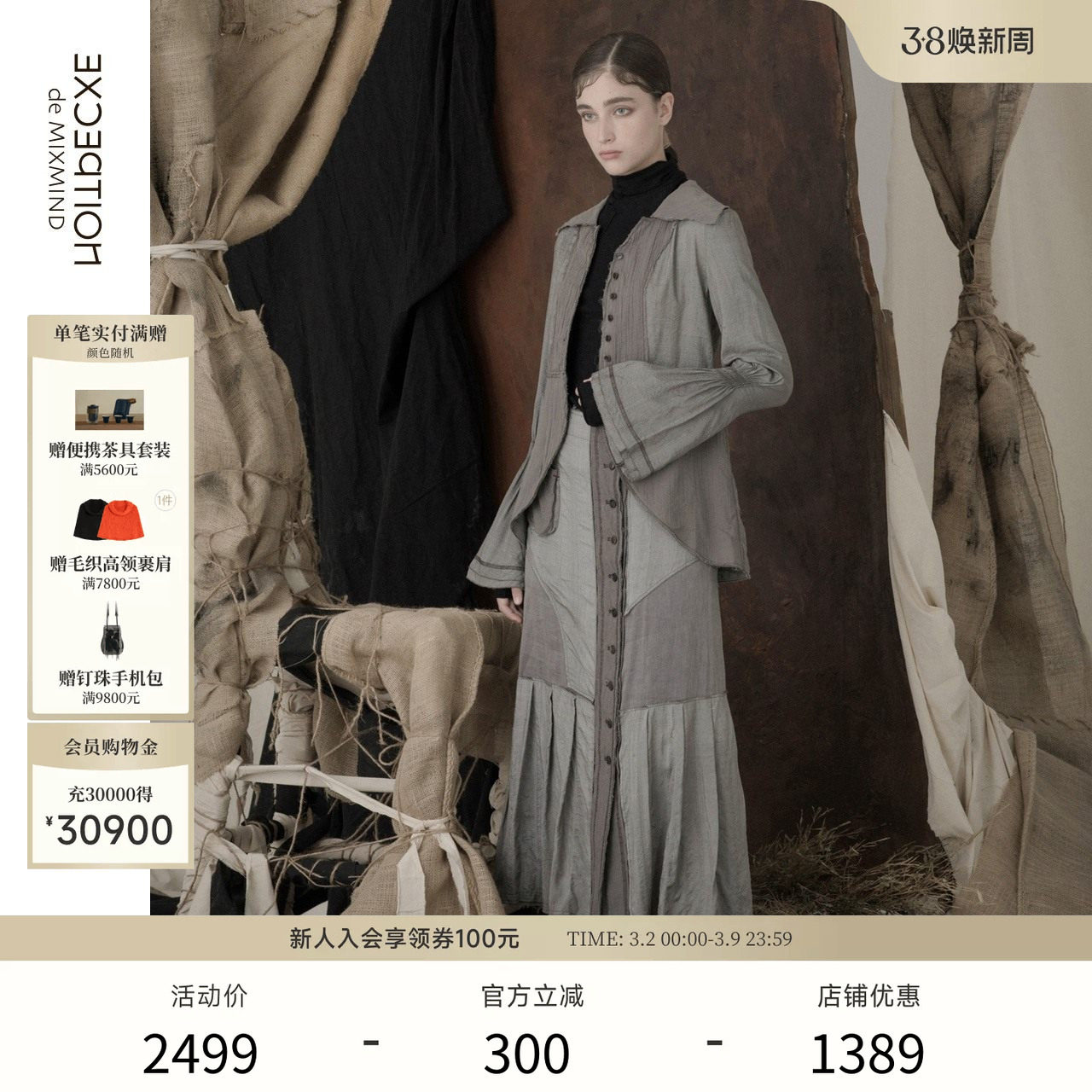 EXCEPTION例外女装秋冬季连衣裙提花图案打褶设计风衣外套