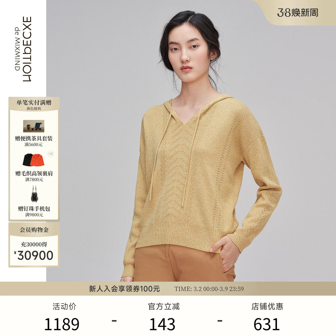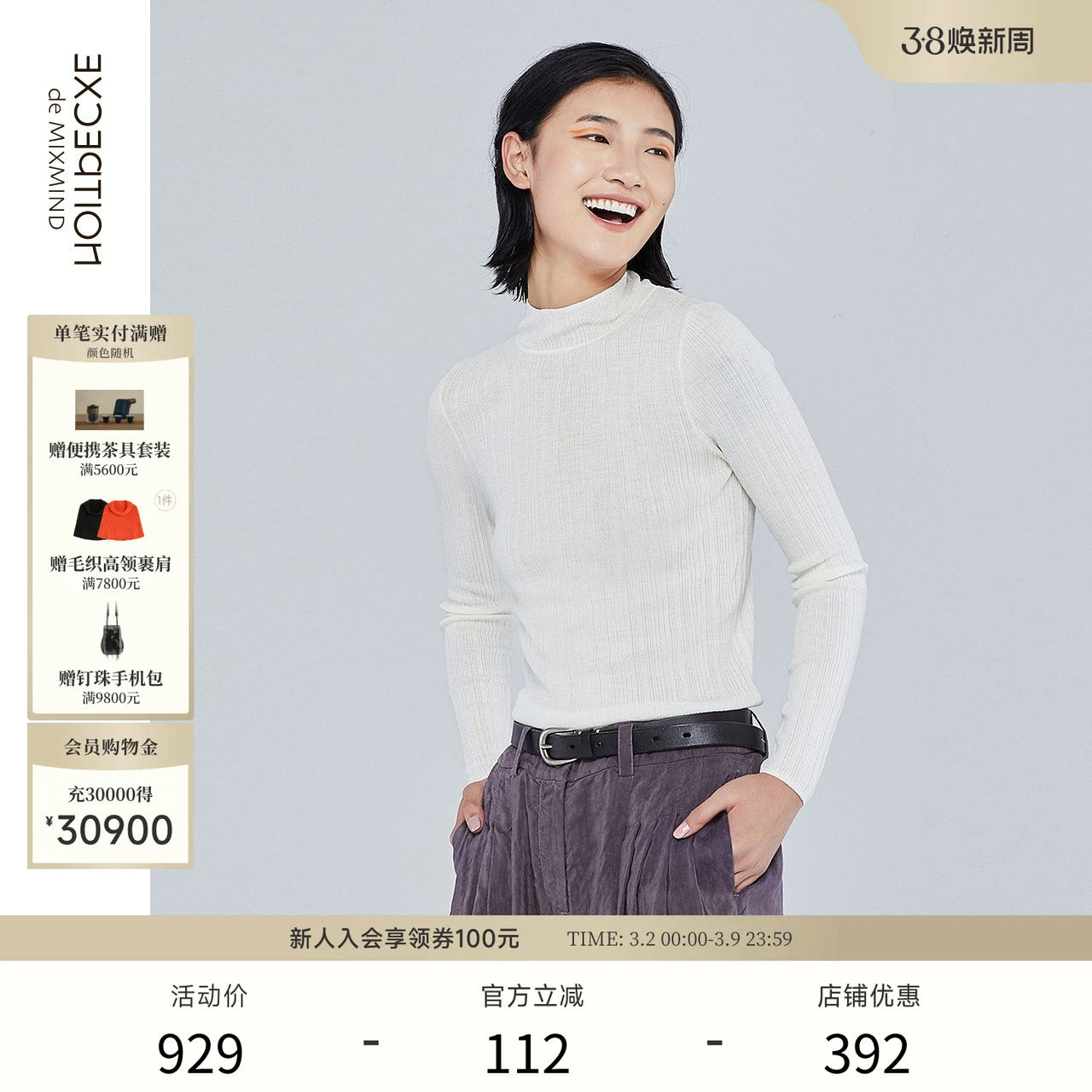 EXCEPTION例外女装春秋双面编织纯棉针织衫拼接设计半高领上衣