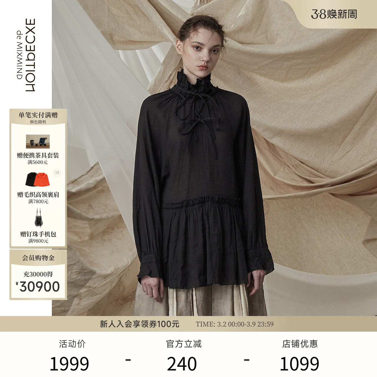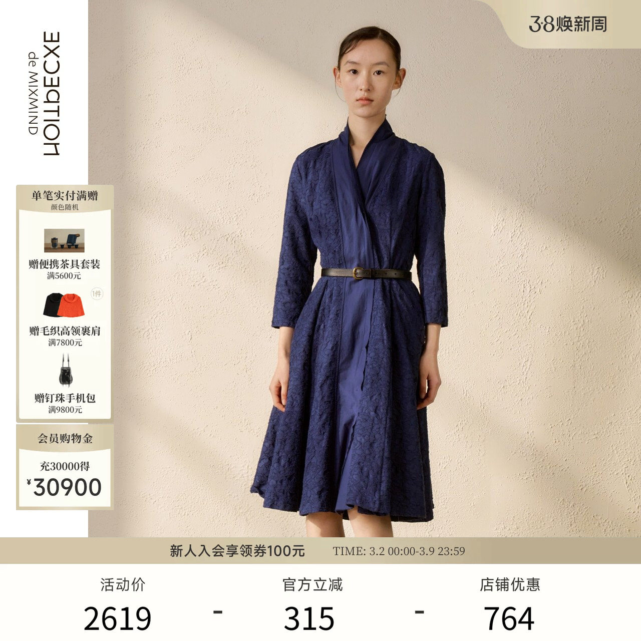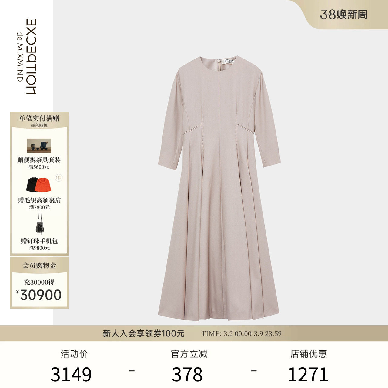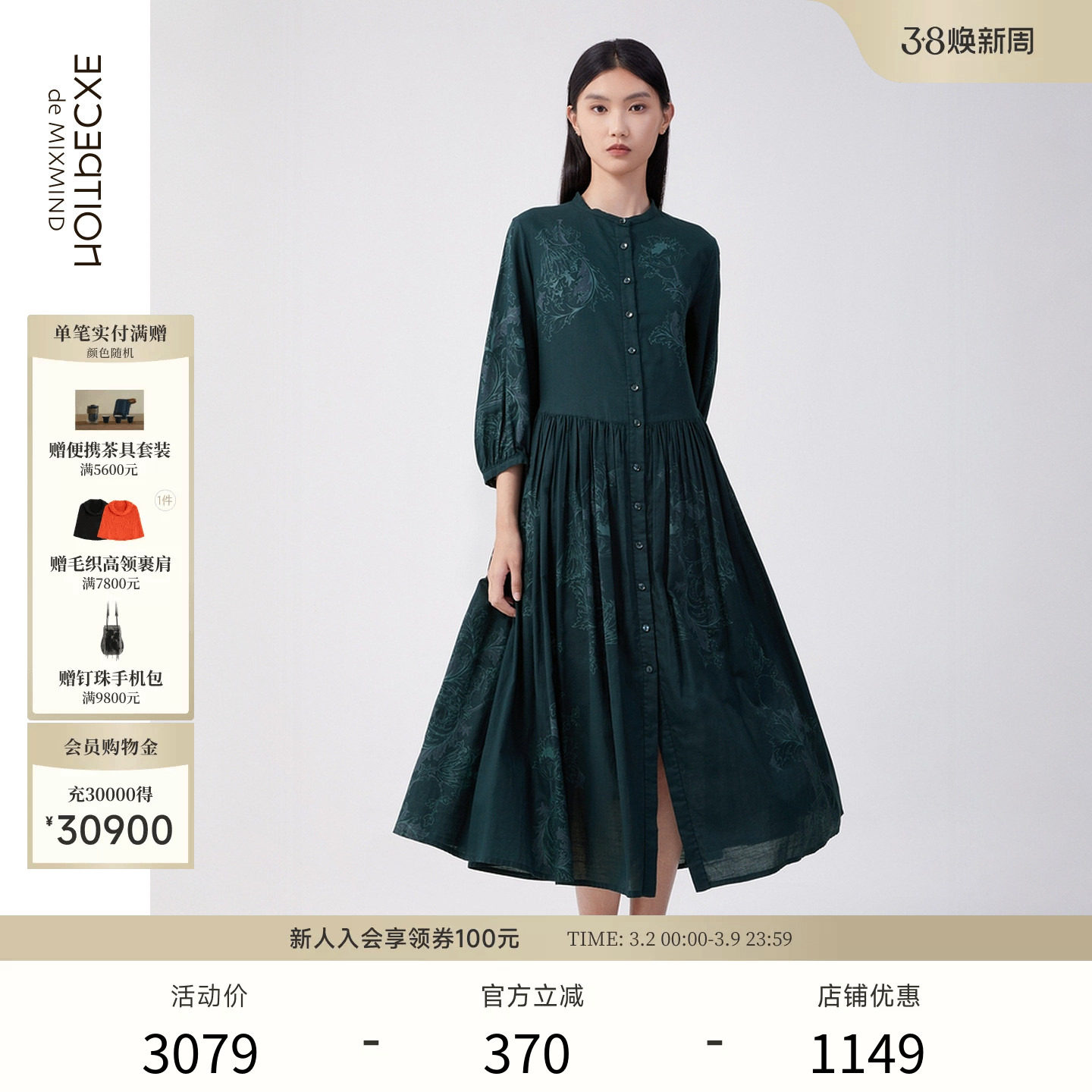 EXCEPTION例外女装早秋提花打褶设计连衣裙新中式交领宽松长裙子