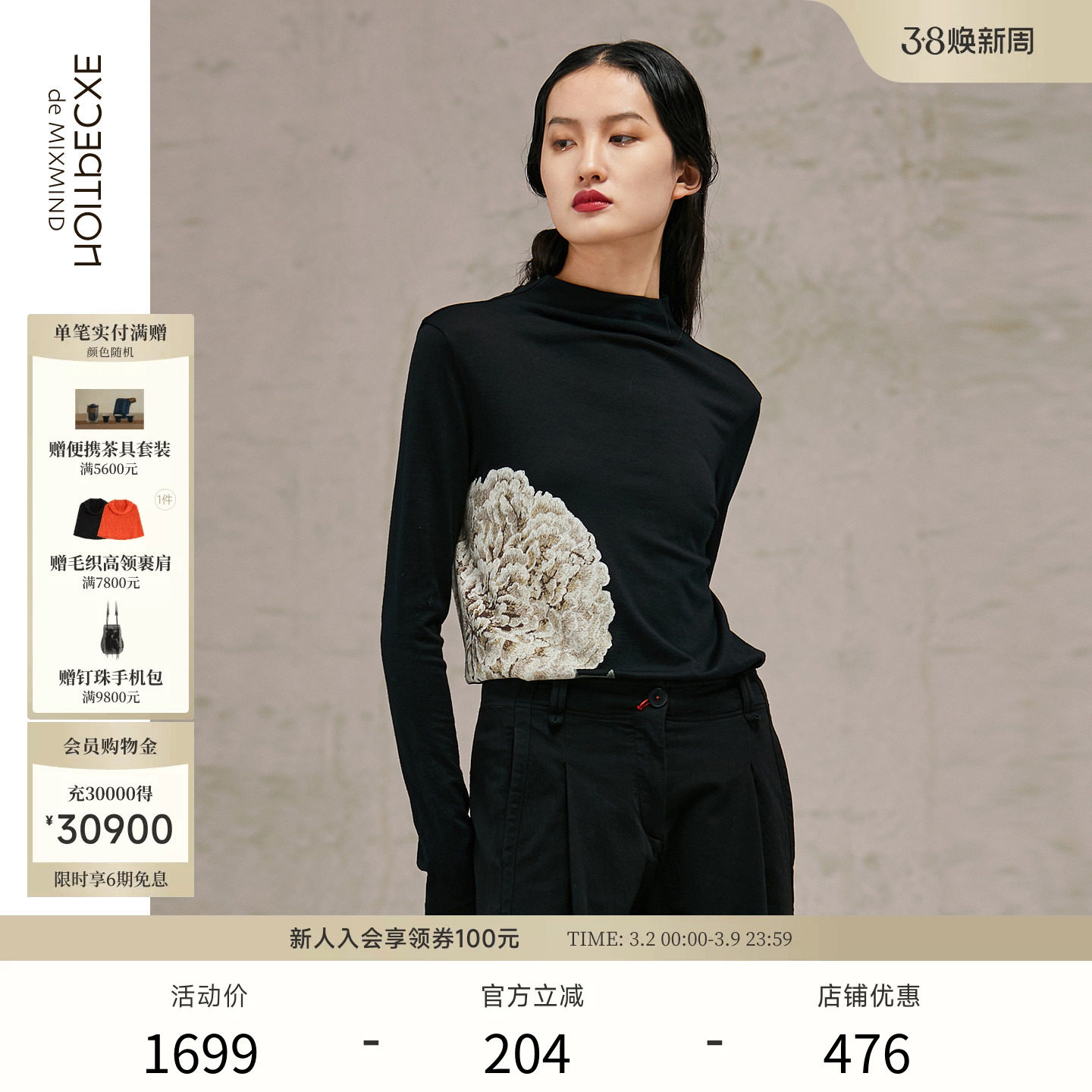 EXCEPTION例外女装中式绵羊毛亲肤牡丹印花工艺毛针织衫