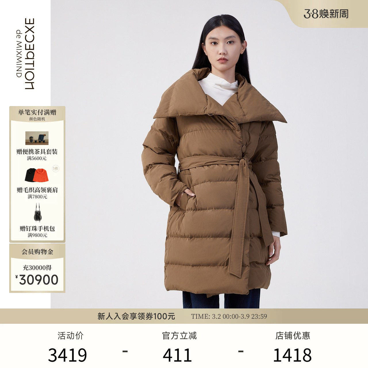 EXCEPTION例外女装秋冬款羽绒服鸭绒保暖系带设计立领长款外套女