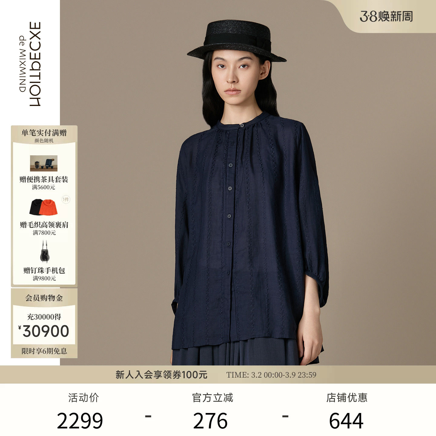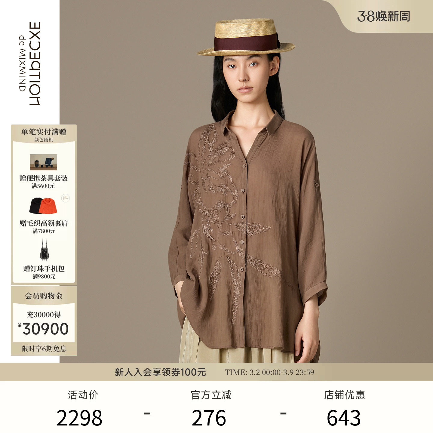 EXCEPTION例外女装苎麻混纺绣花工艺优雅中式上衣宽松长袖衬衫女