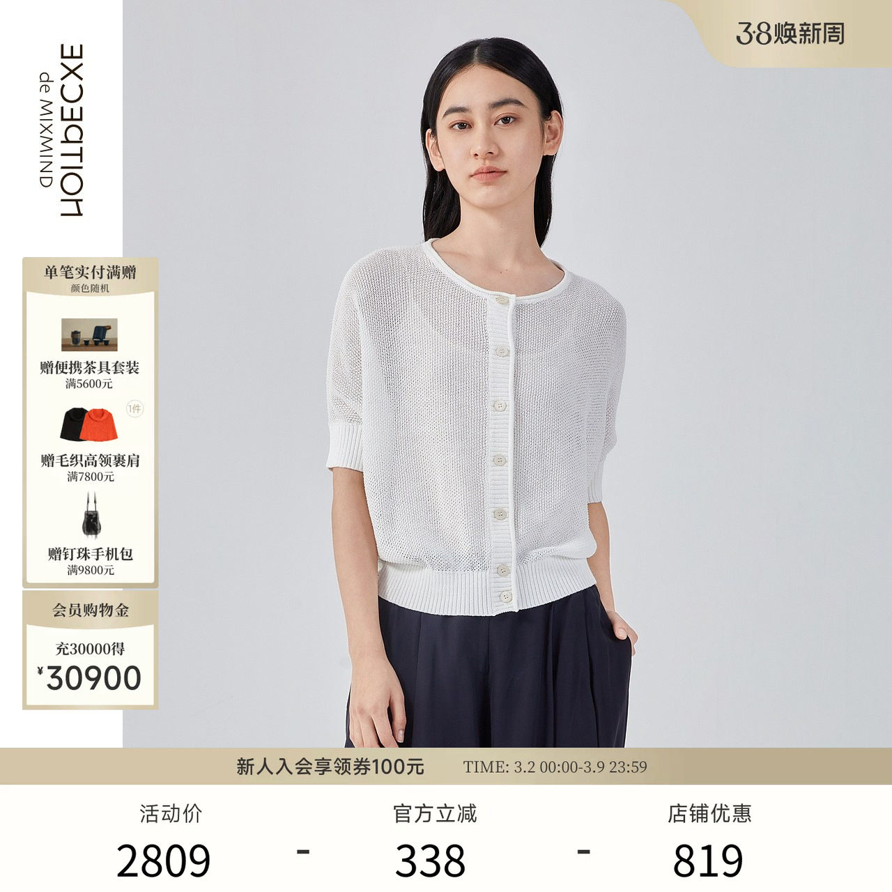 EXCEPTION例外女装春夏款毛针织衫扭结设计镂空宽松低圆领短袖衫