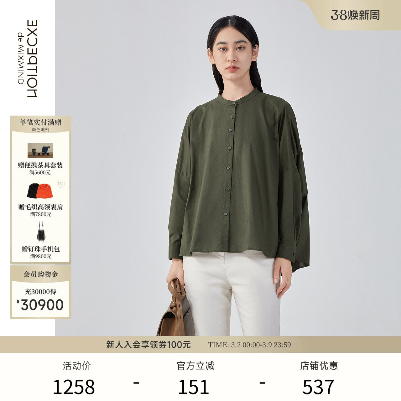 EXCEPTION例外女装春夏款衬衫立领蝙蝠袖设计纯棉宽松衬衣外套女