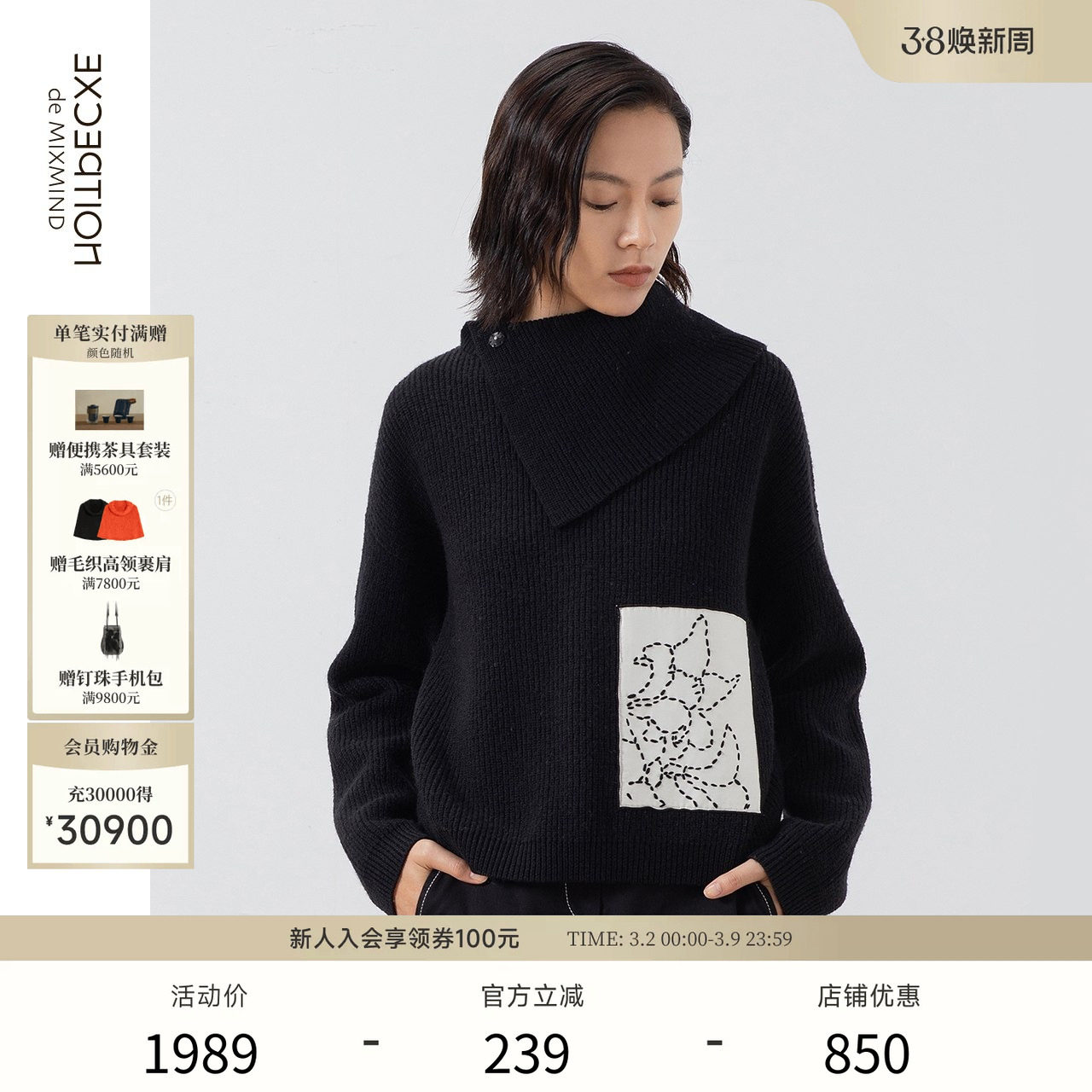 EXCEPTION例外女装羊毛中式缩绒绣花工艺不规则大翻领显瘦毛衣女