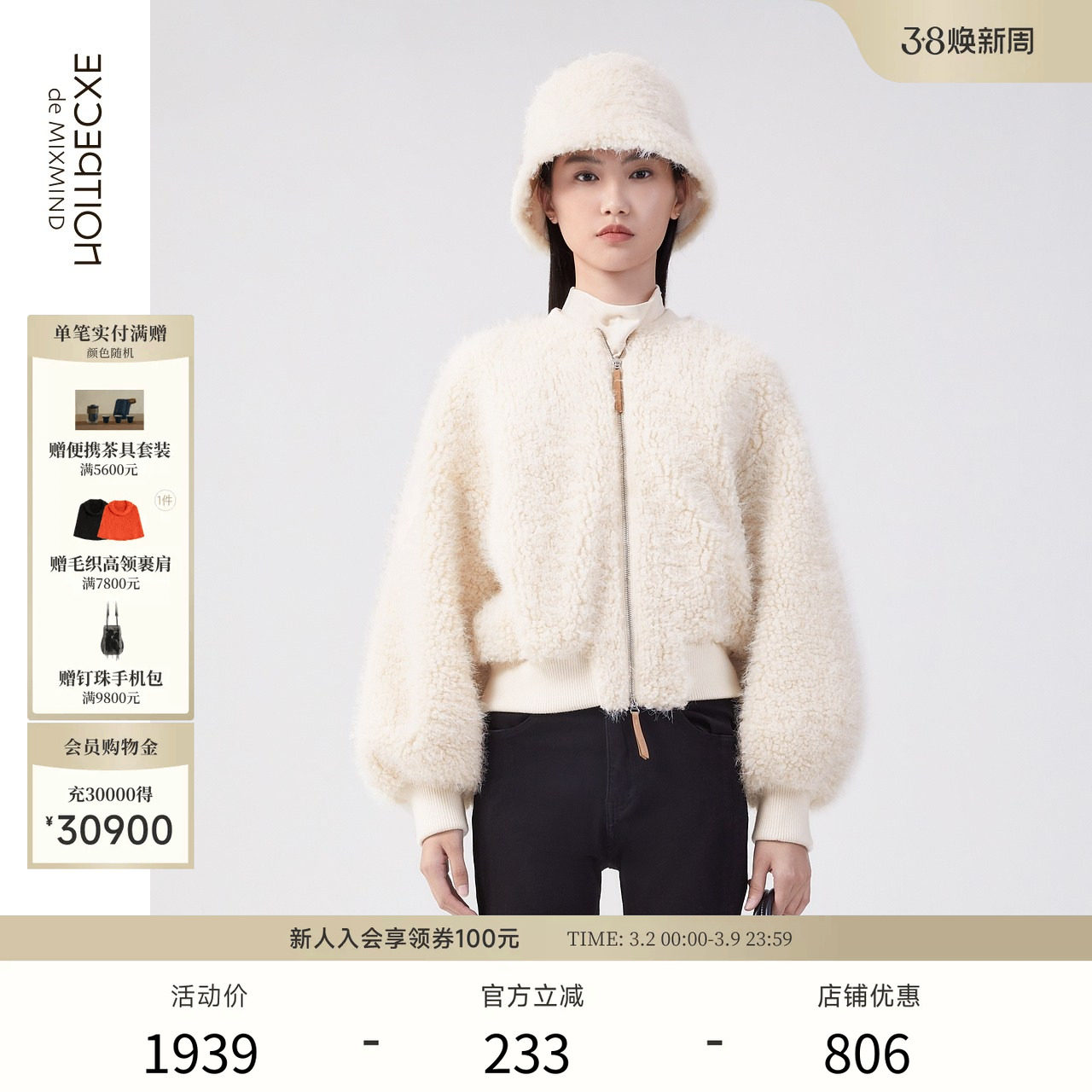EXCEPTION例外女装秋冬款撞色撞料拉链圆领设计宽松保暖短外套女