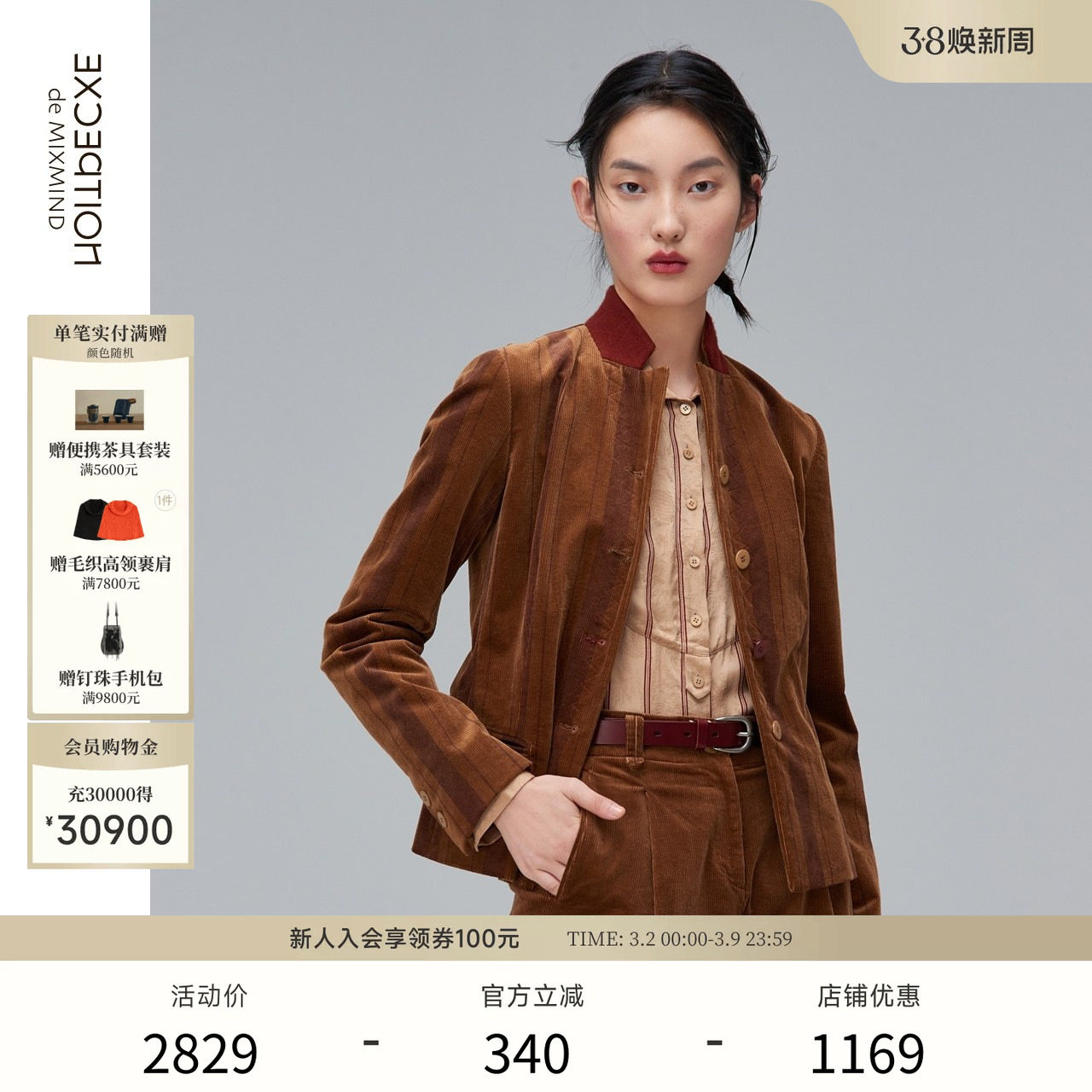 EXCEPTION例外女装秋冬灯芯绒复古中式立领修身气质短款西装外套