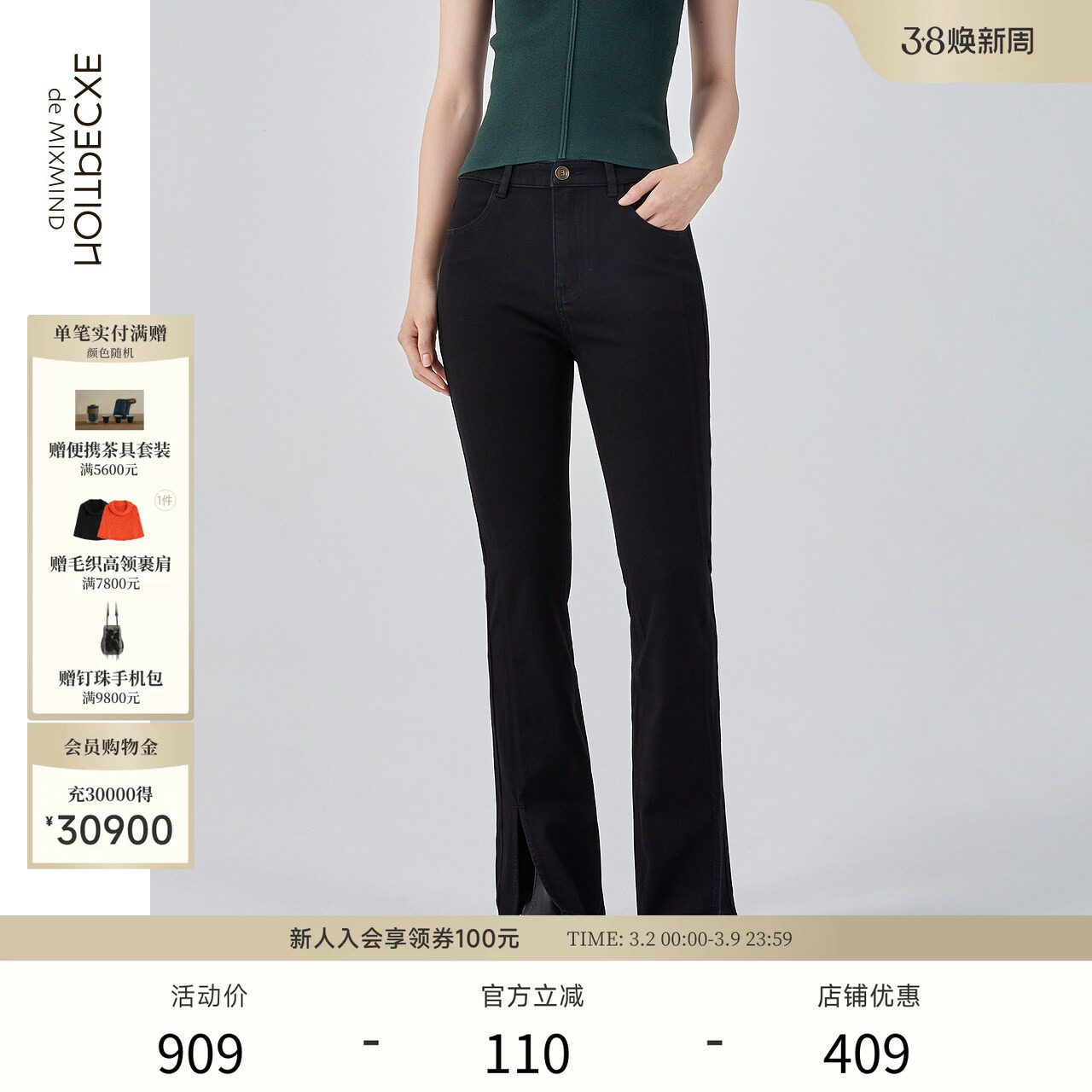 EXCEPTION例外女装春夏款牛仔裤复古高腰设计裤脚开衩裤子喇叭裤