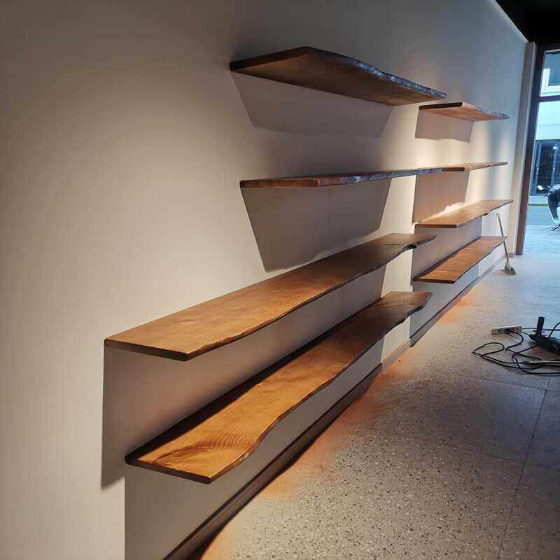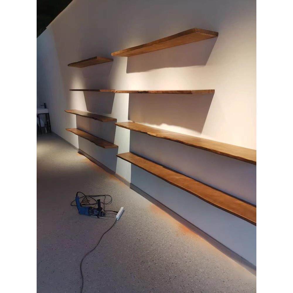 中世纪风格原木一字墙储物架墙挂书架隔断书架层压板展示架背景墙