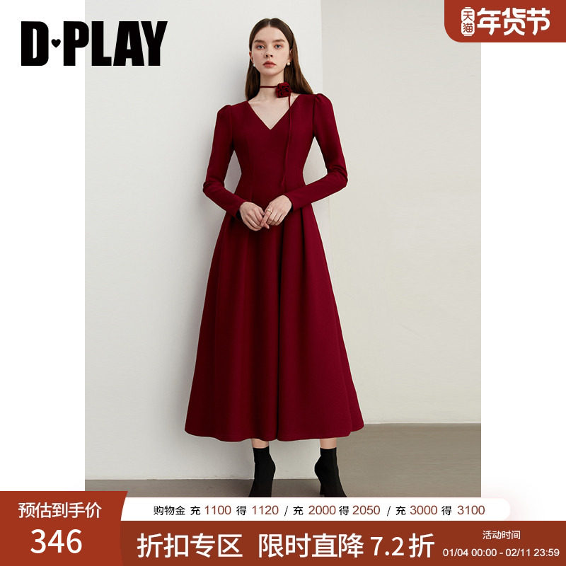 DPLAY2025年秋季红色连衣裙女法式新年结婚订婚礼服裙子长袖红裙