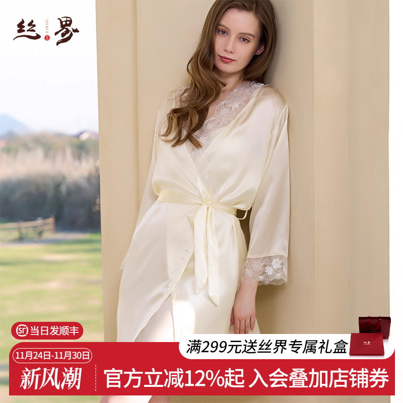 狄兰丝真丝睡袍女秋气质优雅蕾丝晨袍100%桑蚕丝外披浴袍家居服