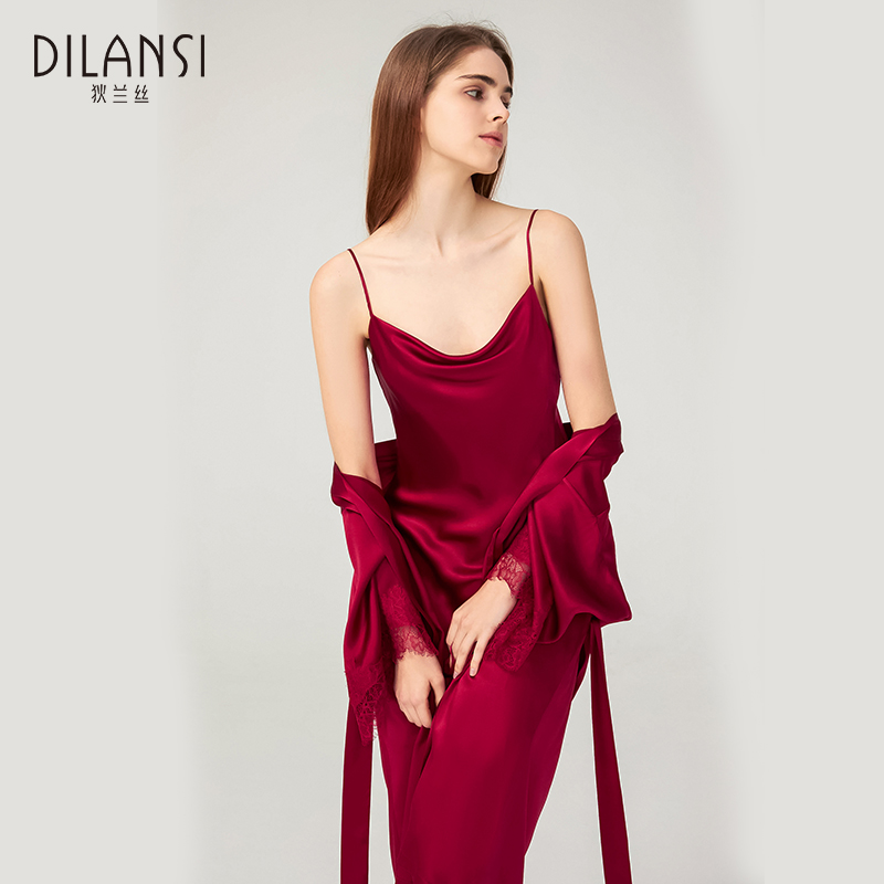 狄兰丝真丝睡袍女重磅新款睡衣蕾丝镂空性感桑蚕丝吊带睡裙两件套