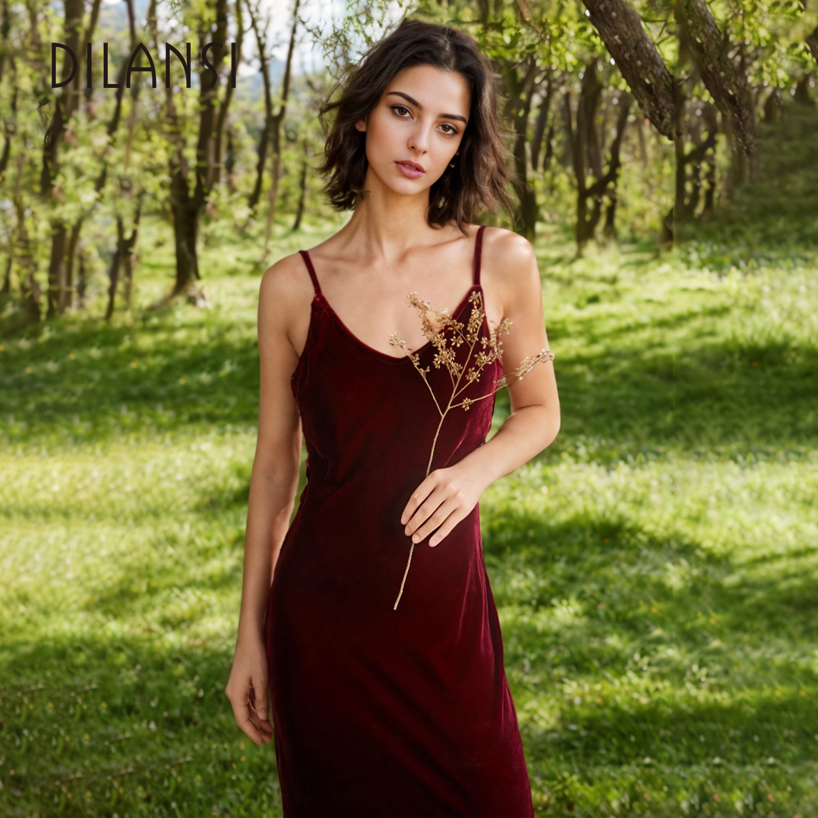 狄兰丝真丝睡袍性感吊带睡裙女居家桑蚕丝睡袍睡衣中长款丝绒睡服