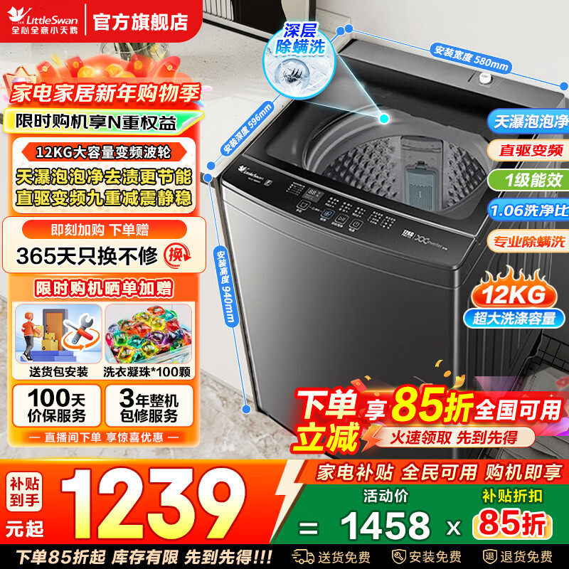 换新补贴小天鹅12公斤全自动洗衣机波轮家用大容量变频除螨1809DT