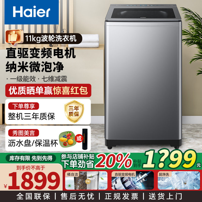 海尔全自动洗衣机波轮11/12公斤直驱变频大容量家用出租屋洗衣机