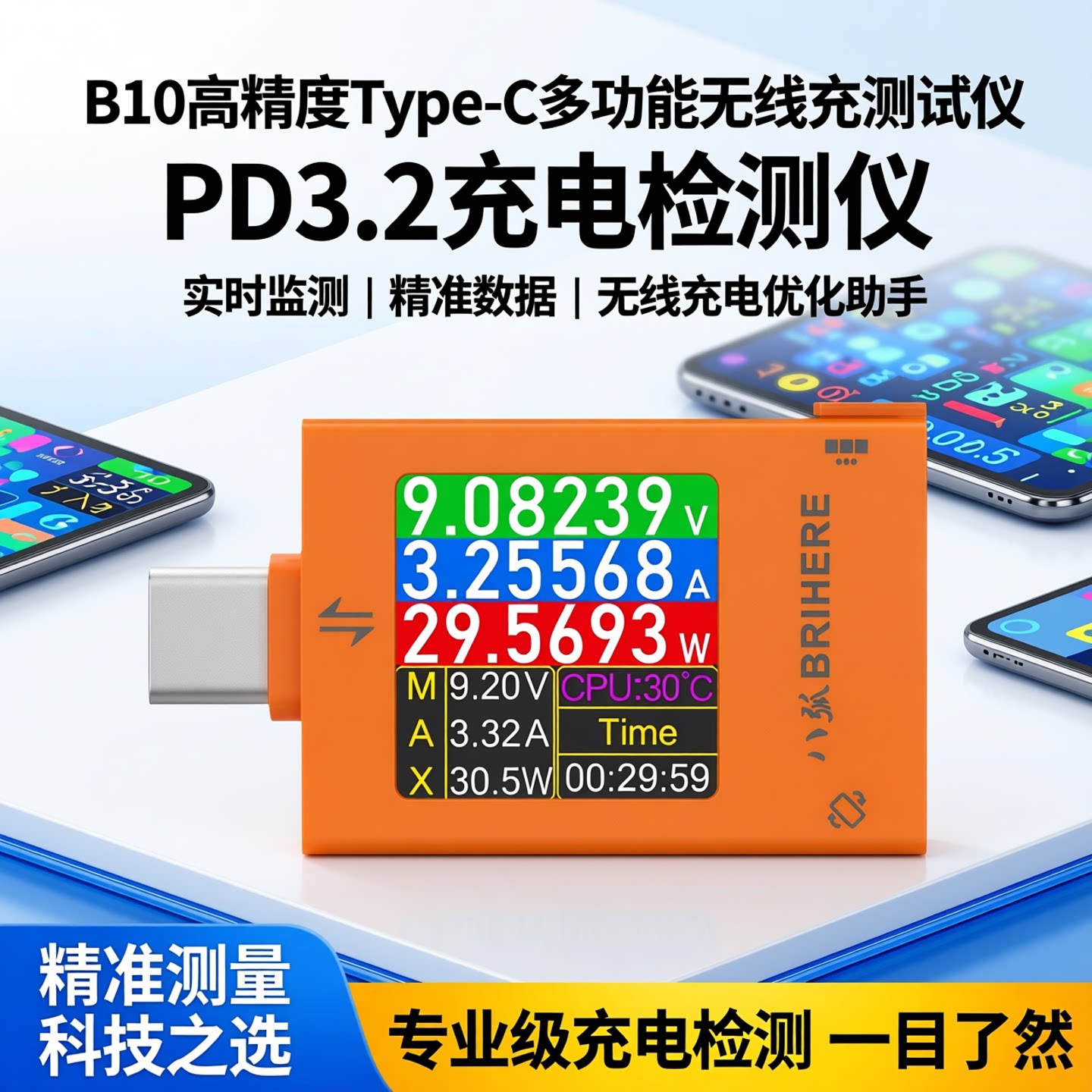 B10高精度Type-c多功能无线充测试USB电压电流表PD3.2充电检测仪